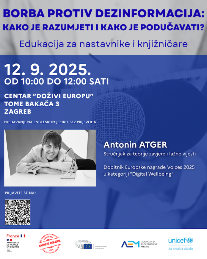 Dvosatna edukacija za nastavnike, knjižničare i druge edukatore pod nazivom “Borba protiv dezinformacija: kako je razumjeti, kako je podučavati” održat će se 12. rujna 2025. od 10 do 12 sati u multimedijskom centru Doživi Europu u Bakačevoj 3 u Zagrebu. Isut organiziraju Francusko veleposlanstvo, Ured Europskog parlamenta u Hrvatskoj, Agencija za elektroničke medije i Ured UNICEF-a za Hrvatsku.