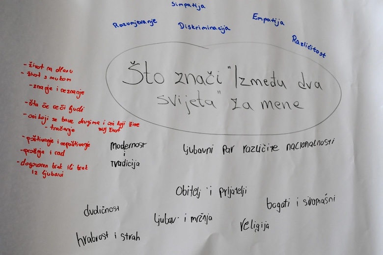 Otvoreni, emocionalni i refleskivni razgovori na kraju, u kojima su sudionici pokazali visoku razinu empatije i svijesti o složenosti vlastitog položaja, proizašli su iz grupnog rada u kojem su svi sudionici bili podijeljeni u tri grupe, a svaka od njih odgovarala je na jedno pitanje: Što za mene znači “između dva svijeta”; Kako mogu biti most, a ne zid; Što želim da većinska zajednica razumije o meni. Zaključili smo da je prostor “između” istodobno i izazovan i oslobađajući. On ne predstavlja prazninu između svjetova, nego most među njima stoga smo zaključili da “biti Rom danas ne znači birati između dva svijeta, nego stvarati treći vlastiti, slobodan i autentičan – onaj koji ih povezuje”.